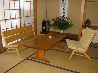 リビングセット 評判上々なラウンジチェア。 床の間にY氏から送っていただいたバラを飾りました。 |